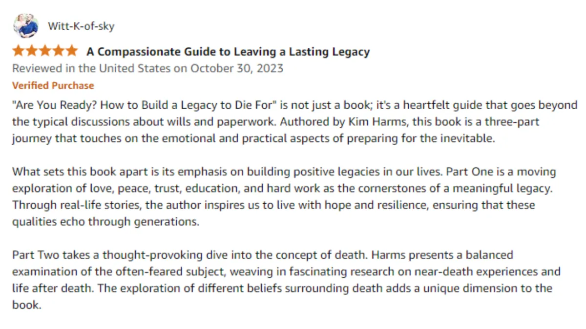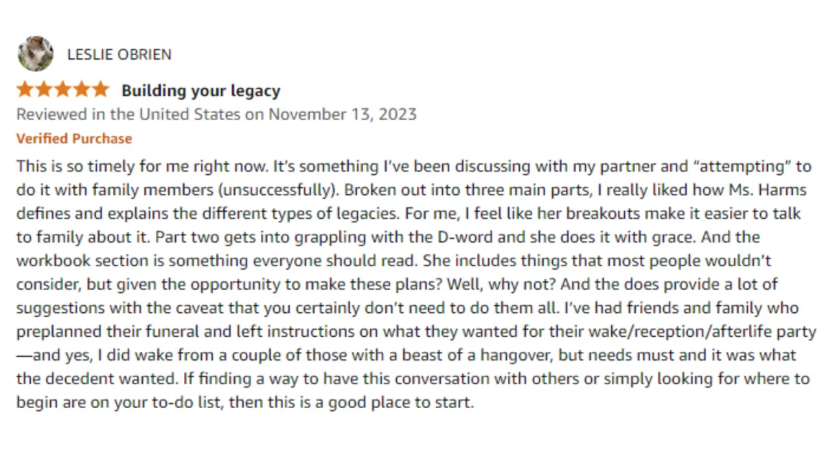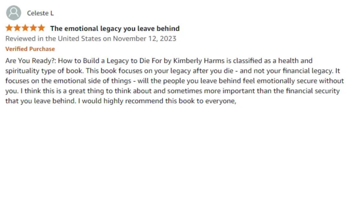 It includes a complete checklist and discussion of traditional legacy documents such as a will, health care directive, and password record as well as an emotional life insurance plan to psychologically help our loved ones survive and thrive in a time when we are no longer physically present with them.